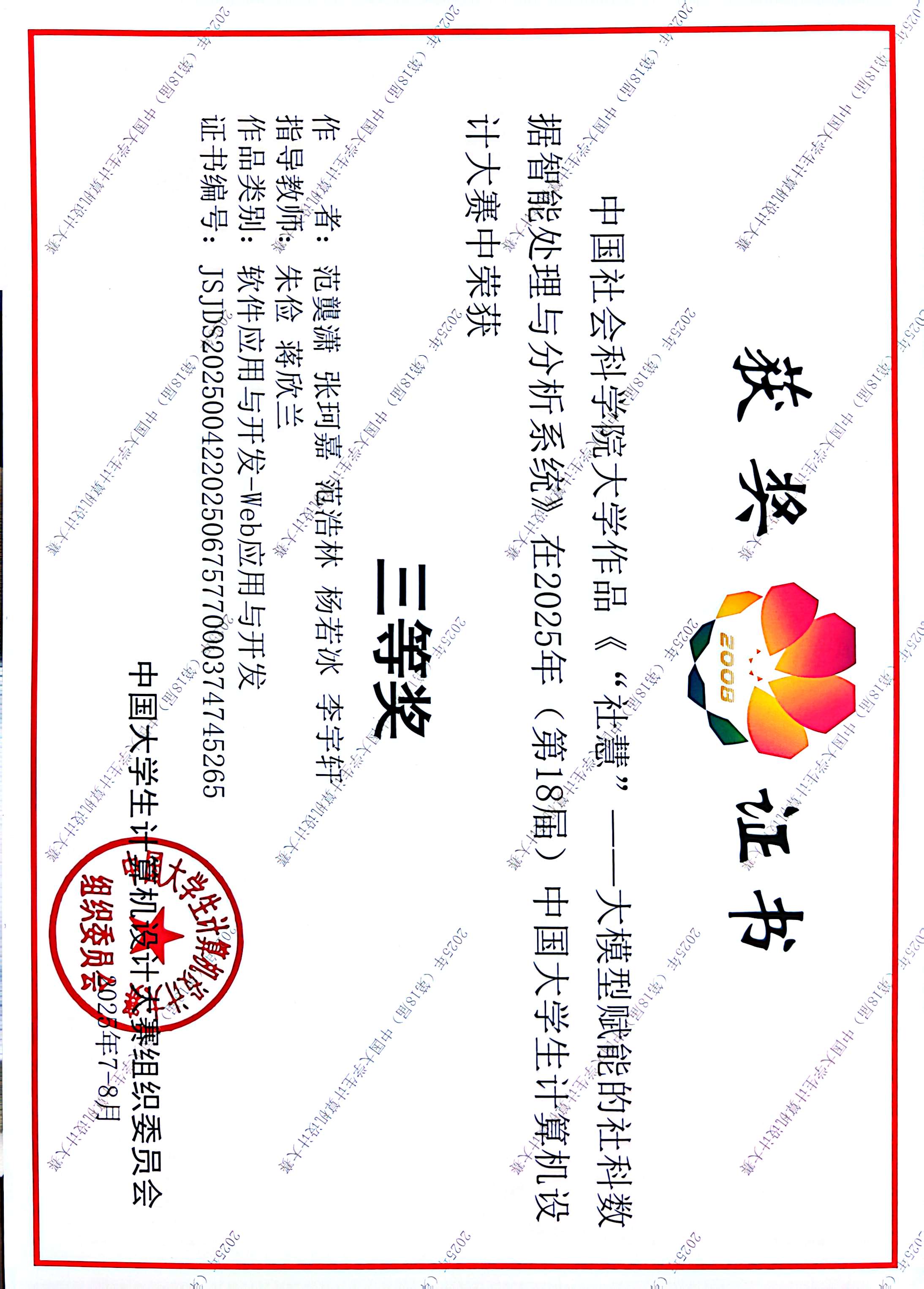 近日,第18届中国大学生计算机设计大赛国赛成绩公布,我校学生团队凭借作品《“社慧”——大模型赋能的社科数据智能处理与分析系统》,在“软件应用与开发-Web应用与开发”类别中荣获国赛三等奖。